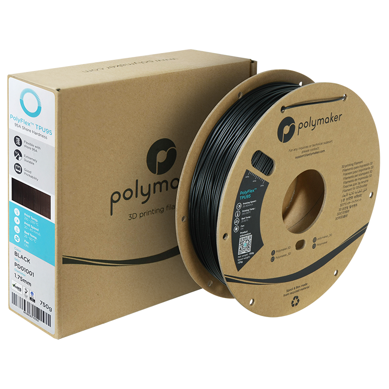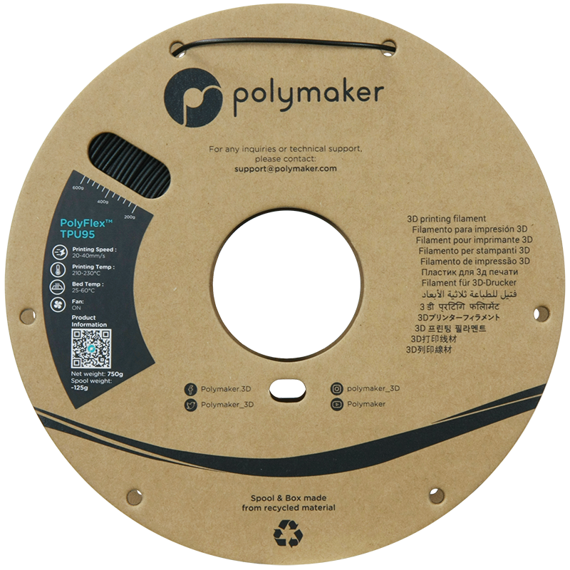 PolyFlex™ TPU95 is een flexibel filament met een shore-hardheid van 95A, wat perfect geschikt is voor de meeste flexibele toepassingen. Door de wanddikte en infill nauwkeurig af te stellen tijdens het printen, kunt u de flexibiliteit van uw geprinte onderdeel verder aanpassen. TPU95 is extreem duurzaam en kan meer dan 3 keer zijn oorspronkelijke lengte uitrekken zonder te breken.
